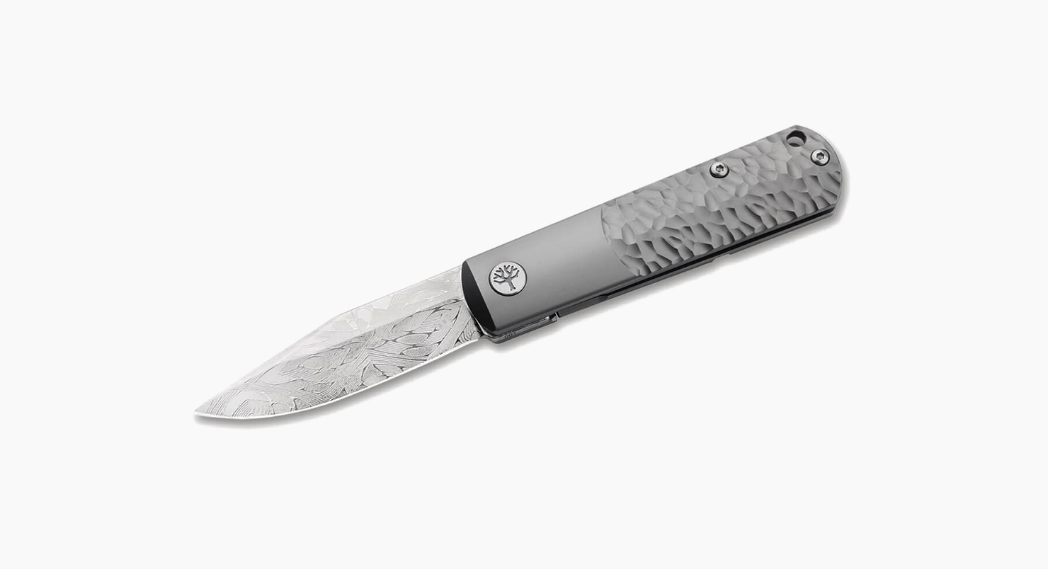 В остальном конструкция осталась практически без изменений — и это логично, так как улучшать там было почти нечего. Титановая рукоять с framelock-замком сохранила прецизионно фрезерованную текстуру, вдохновленную метеоритом: она не только эффектно выглядит, но и обеспечивает уверенный хват. Классический силуэт Barlow с удлинённым передним больстером плавно переходит в асимметричную «космическую» текстуру в задней части рукояти.