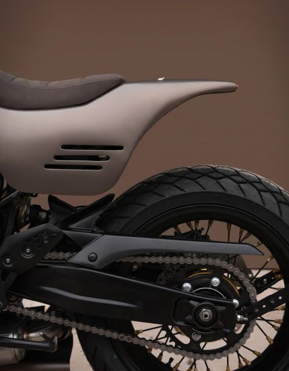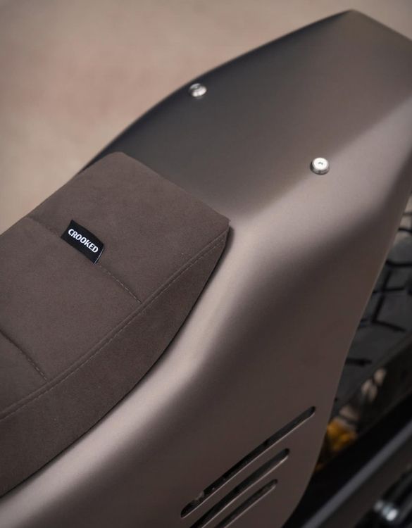 Кузовные элементы — то, что действительно выделяет Crooked700. Ручной работы стальной топливный бак заключён в цельную стеклопластиковую оболочку, формируя чистый и органичный силуэт, вдохновлённый классическими flat track-мотоциклами. Интегрированный задний фонарь, выдвижная крышка бака, сиденье с отделкой из алькантары и кастомный корпус LED-фары добавляют изысканности, не нарушая общего визуального потока.