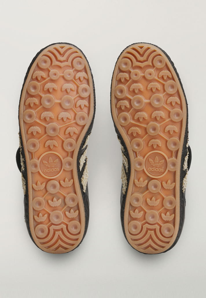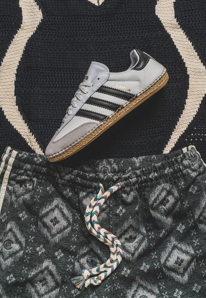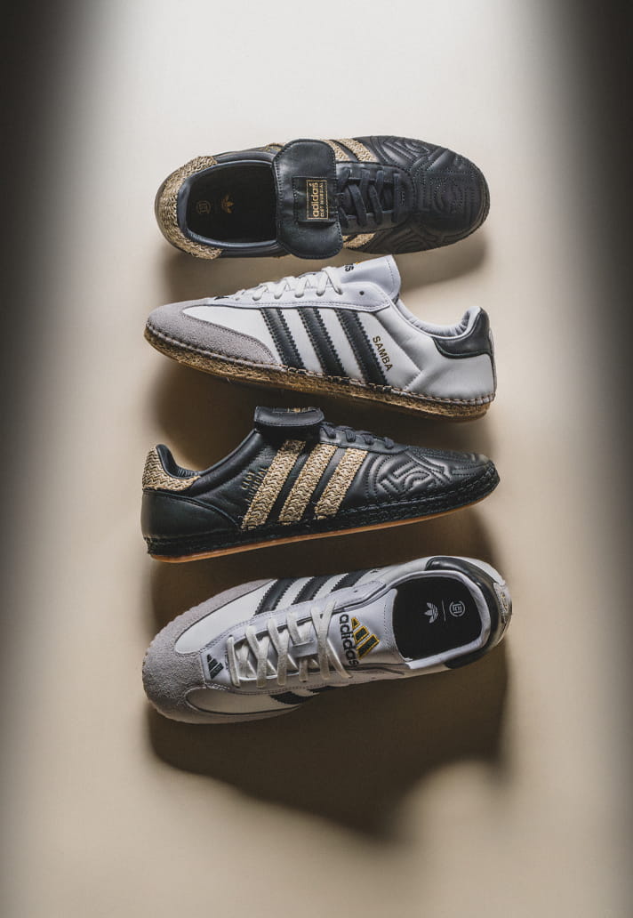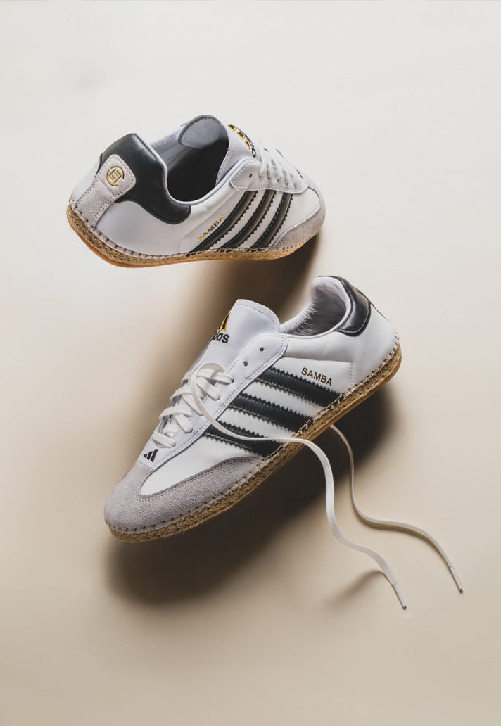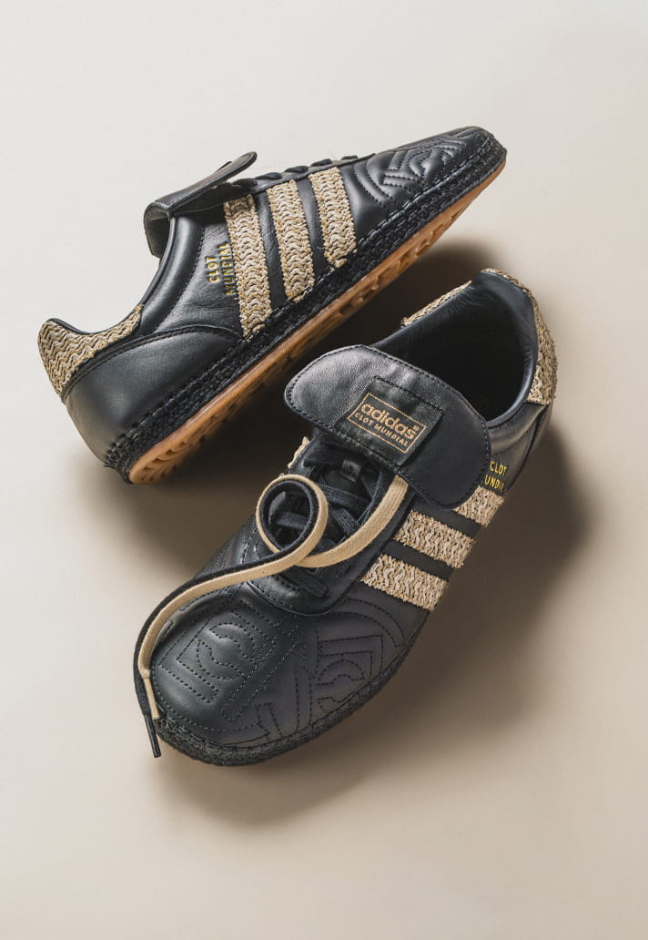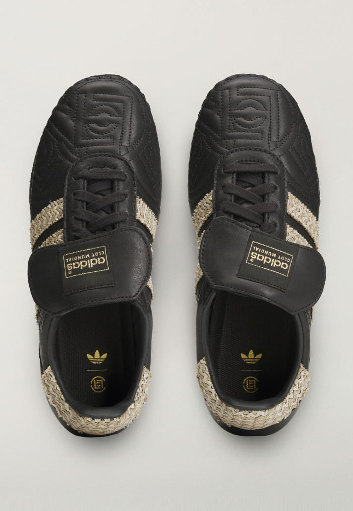 CLOT Samba движется по той же логике: верх от Samba Millennium, замшевый мысок и отделка из рафии внизу. Контраст и текстура работают здесь как главные инструменты, превращая трибунную классику в продуманный и носимый предмет за пределами матчевого дня.