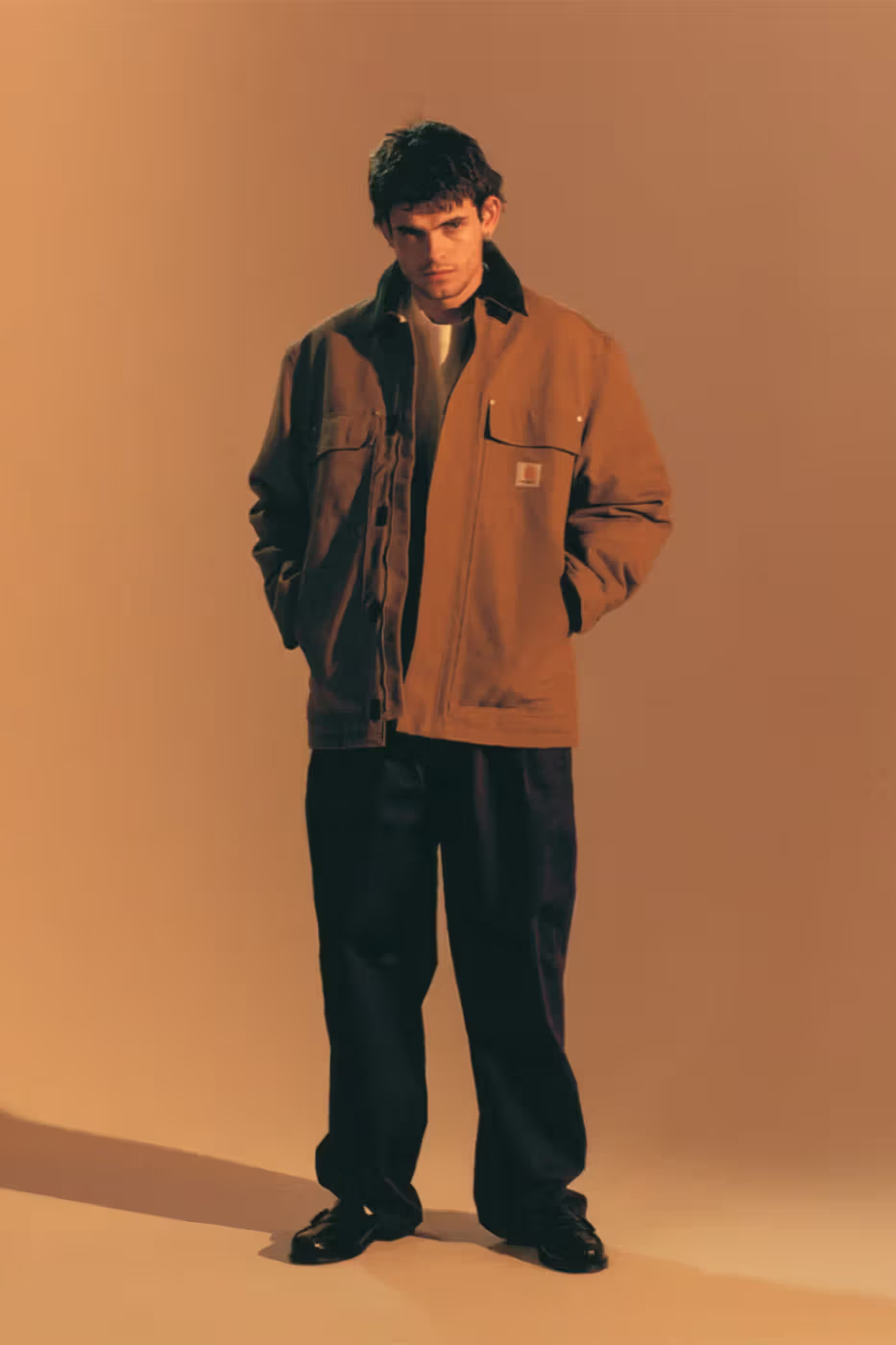 Верхняя одежда развивает диалог с архивным рабочим наследием Carhartt. Среди ключевых моделей — пальто Adair Coat, заимствующее функциональные элементы у винтажных пожарных курток, включая металлические клипсы-застёжки. Ещё один акцент — куртка Shepton Jacket, переосмысляющая пропорции классической лётной куртки B-6.