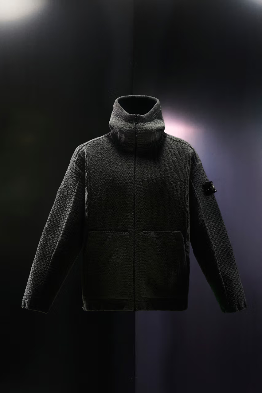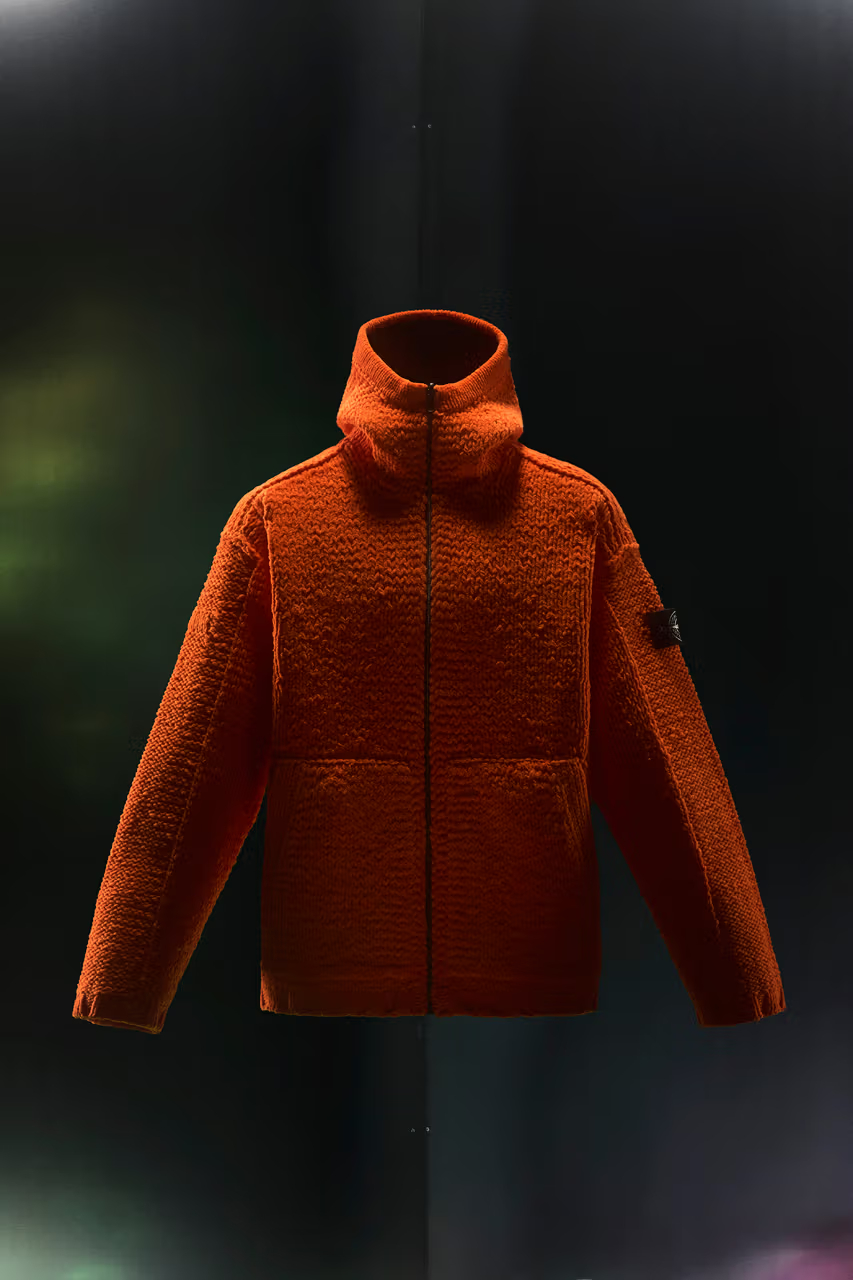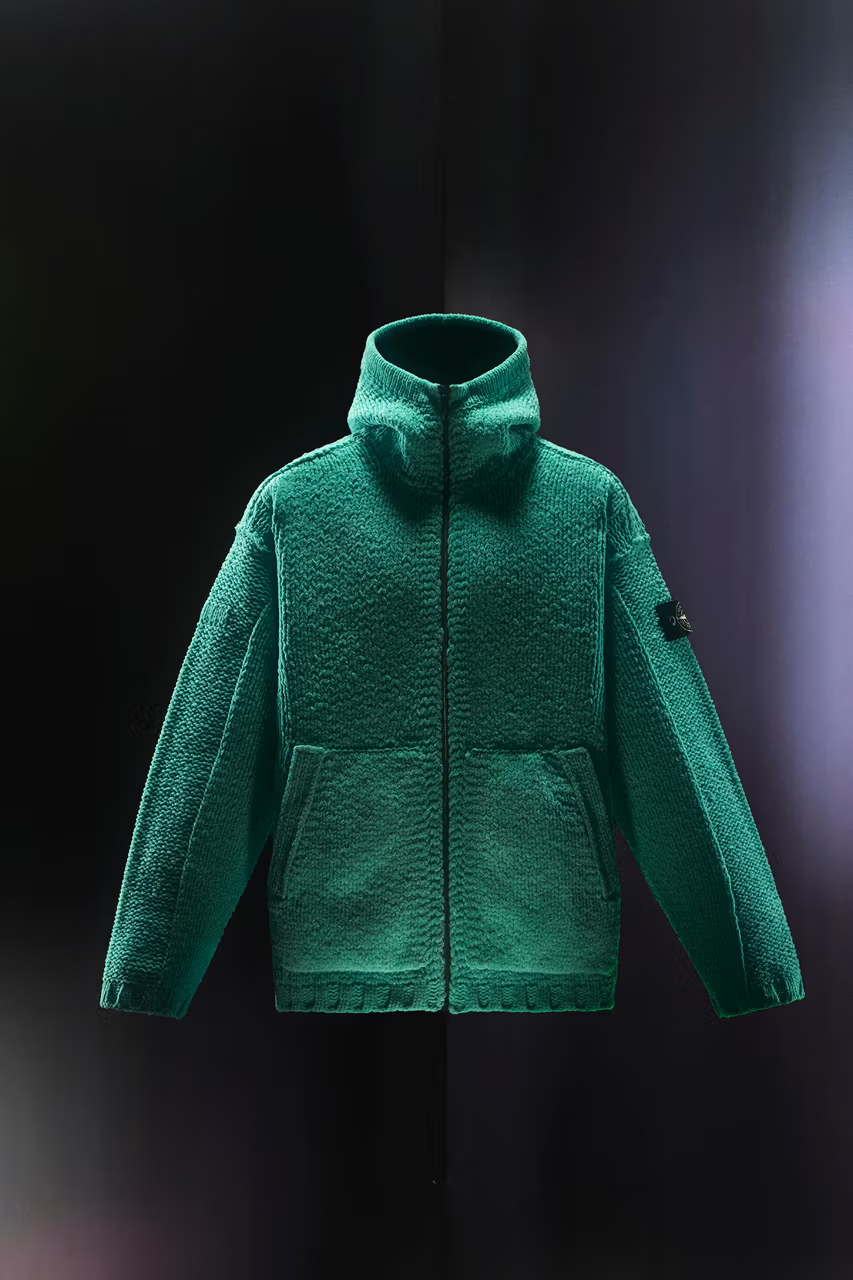 Продолжая линию исследовательских экспериментов, в этом году Stone Island впервые сосредоточился на трикотаже. В основе новинки — инновационный air-blown laminated knit: метод ламинирования, при котором вязаная структура получает свойства полноценной верхней одежды. Модель выполнена в формате хлопкового худи-кардигана из шенилла и рассчитана на двустороннюю носку. За счёт этого каждая куртка не только уникальна по цвету, но и вариативна по стилю.