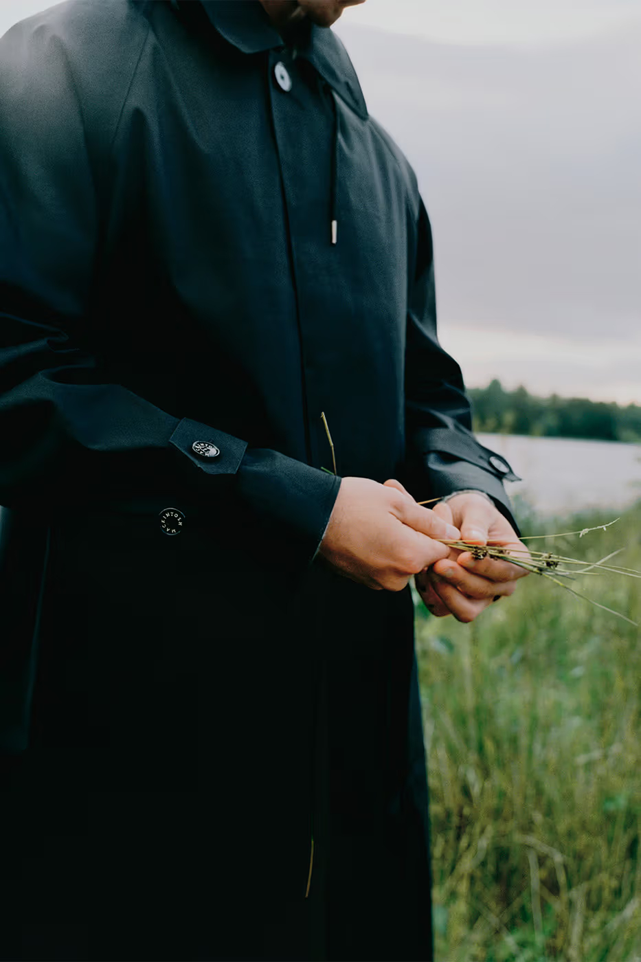 В капсуле переосмыслили два главных силуэта. Тренч от Mackintosh получил съемный капюшон с линзами — визитную карточку C.P. Company. Теперь это не просто классика, а городская униформа с характером.