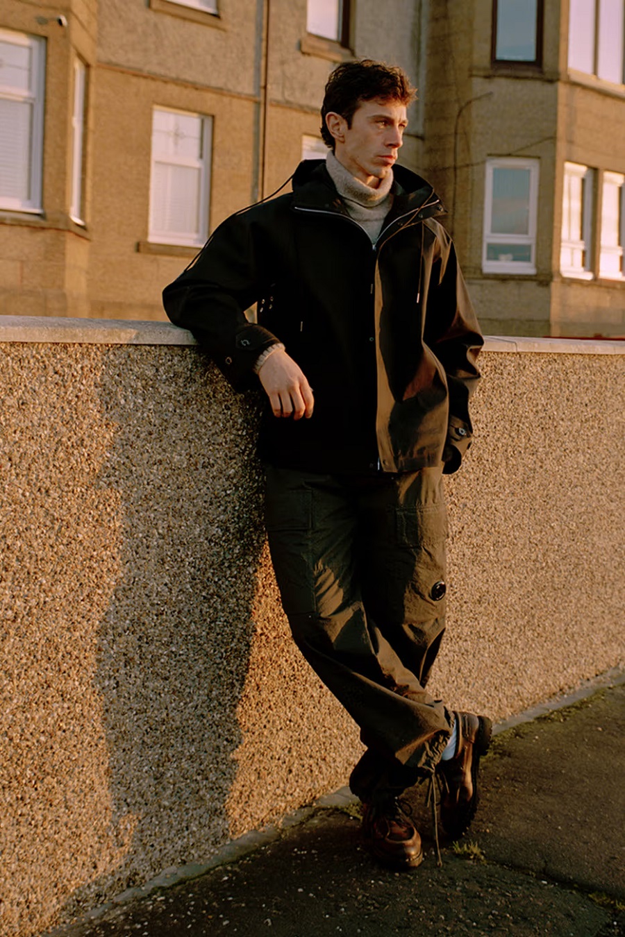 Вторая вещь — знаменитая куртка с очками от C.P. Company. Ее полностью переработали, использовав жесткий структурированный хлопок Mackintosh. На выходе получился злой, утилитарный предмет с идеальными линиями британского пошива. Контраст текстур здесь играет главную роль.