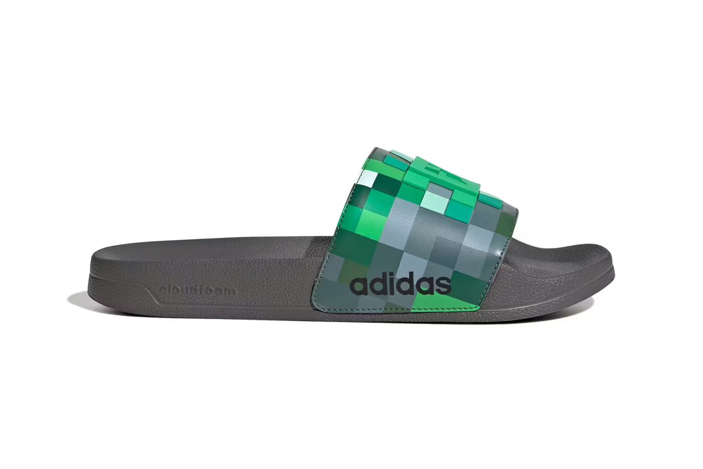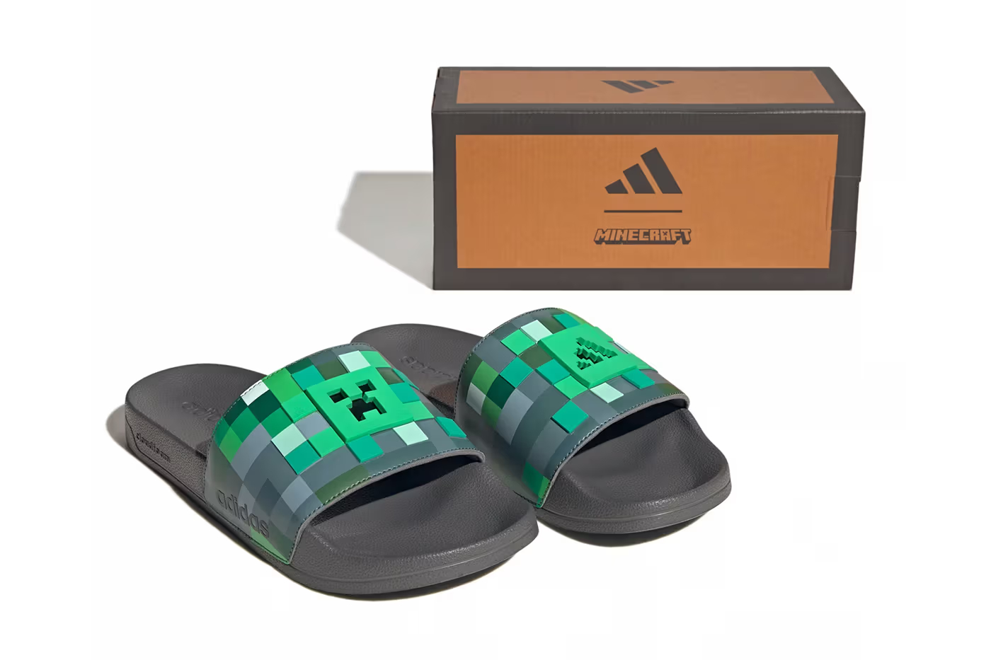 Adilette вновь возвращаются к теме Крипера: голова моба размещена на ремешке, а упаковка стилизована под фирменные сундуки из игры.
