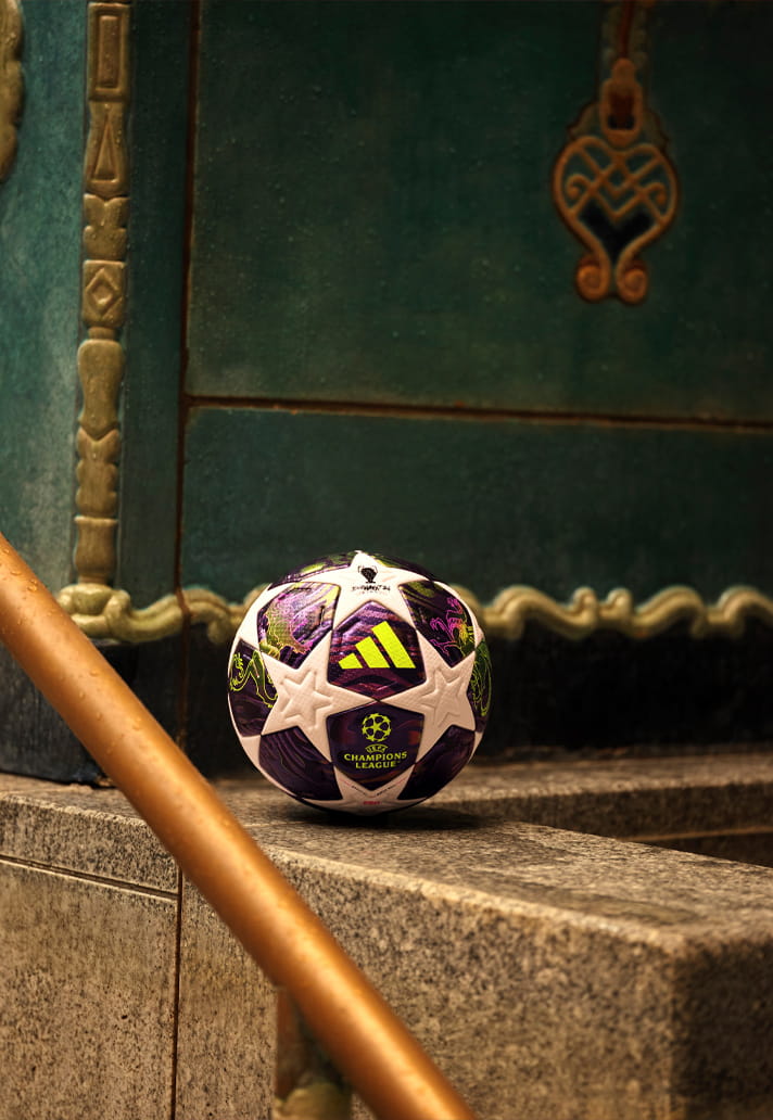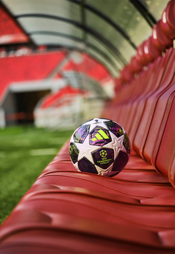 Фиолетовое ядро обрамлено чисто-белыми фирменными звёздными панелями adidas, намеренно оставленными лаконичными, чтобы заякорить дизайн. Между ними — слоистые фиолетовые блоки и динамичная графика, добавляющие глубину, ритм и ощущение движения, даже когда мяч неподвижен.