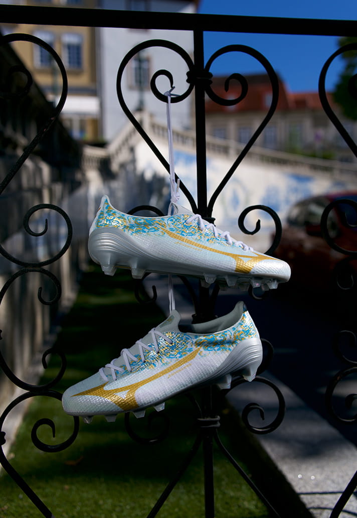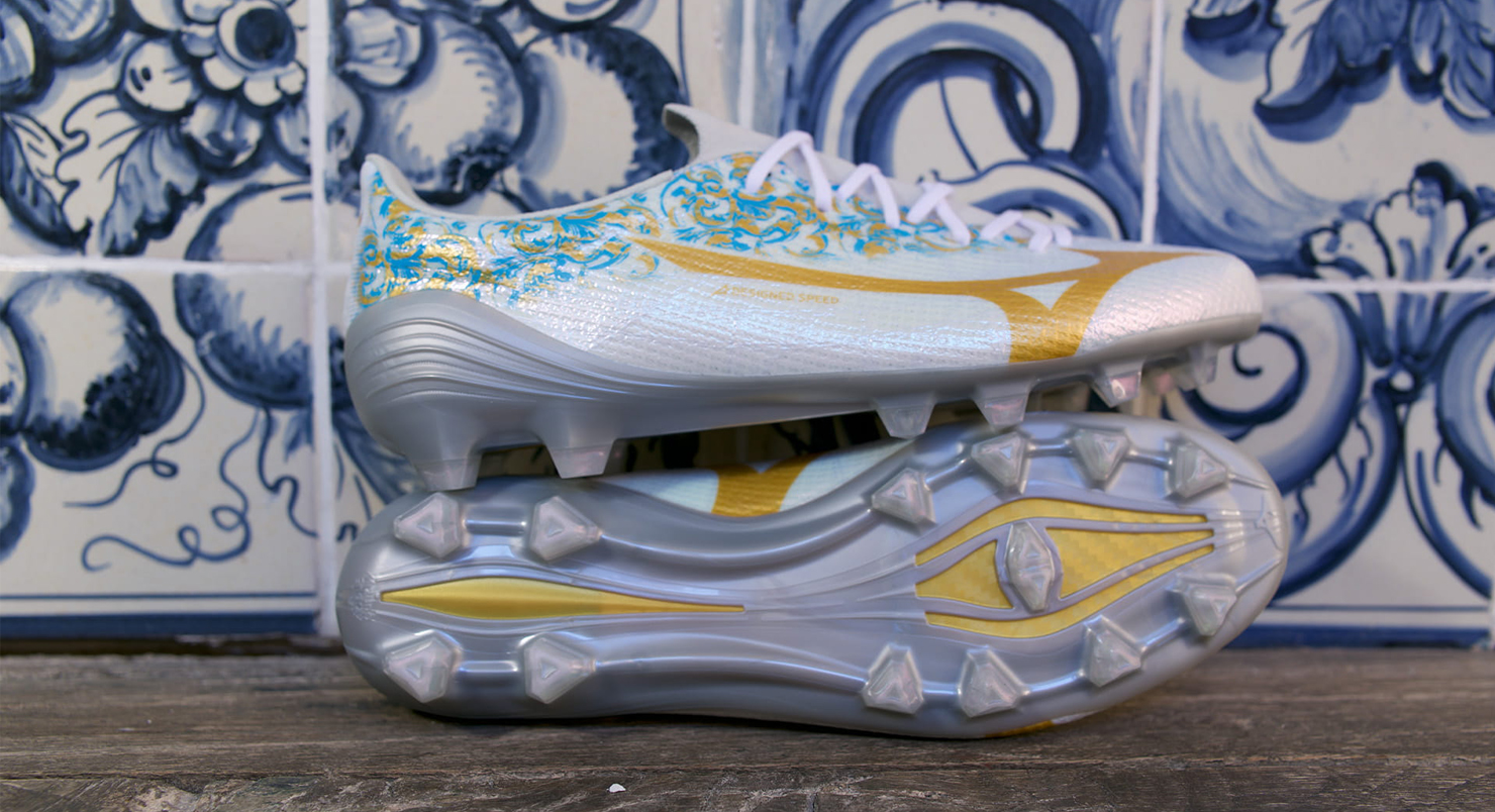 Теперь про детали. Mizuno замешали в дизайн отсылки к португальской плитке азулежу. Паттерны вплетены в текстуру бутсы тактично, но они есть. Азулежу всегда про баланс между структурой и свободой — прямо как стиль самого Феликса. Элегантно, интеллектуально, непредсказуемо, но под контролем.