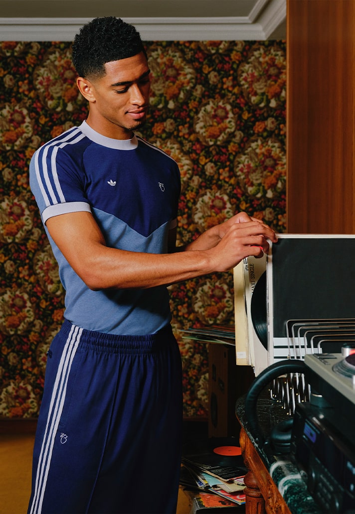 Футболка из мягкого интерлока имеет приталенный крой и рассчитана на повседневную носку. Спортивная куртка отсылает к фирменному жесту празднования Беллингема через V-образный крой, символ уверенности и характера. Комплект дополняют трек-штаны в светло-сером и тёмно-синем исполнении — комфортные, минималистичные, универсальные. Даже носки получили вышитый логотип JB — финальный штрих полной, продуманной истории.