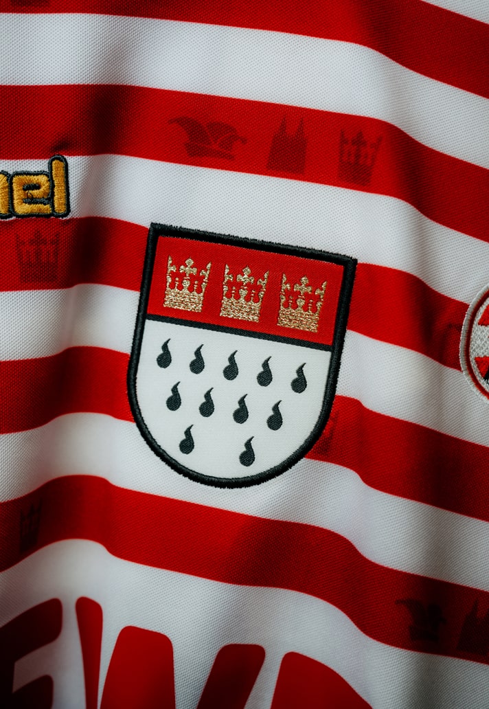 Материал полностью изготовлен из 100% переработанного полиэстера, что подчёркивает курс клуба на устойчивое развитие. Если присмотреться, на ткани можно различить тиснёные символы города — герб, шпили собора и корону. На груди расположился золотой герб Кёльна, а на вороте выгравировано «1. FC KÖLN – 1948 – 1. FC KÖLN». На спине под воротником — официальный девиз карнавала 2025 года.