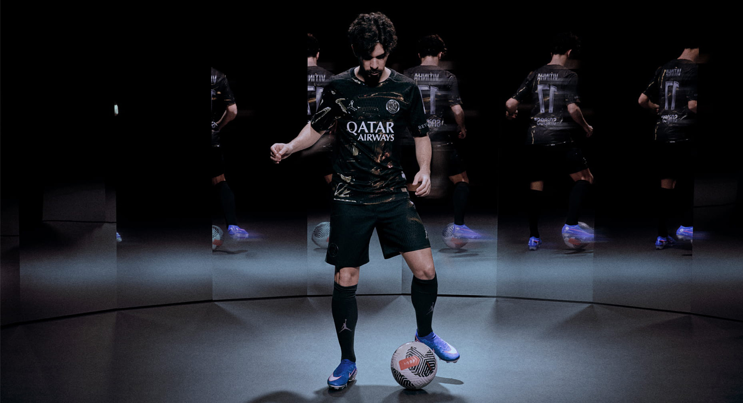 Весь принт на форме — хром и черный, никаких лишних цветов. Но фишка не в цветах, а в текстуре. Графика на ткани — это обработанные 360-градусные кадры, снятые на Трокадеро. То самое место, где вечерняя толпа смешивает туристов, скейтеров и местных. Кадры превратили в абстрактный паттерн, который имитирует блики и отражения ночного города. На джерси ПСЖ такой подход используют впервые.